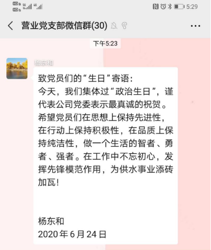 烏海市海勃灣城市供水有限公司為進(jìn)一步增強(qiáng)主題教育的吸引力和感染力,于6月24日開展黨員“過政治生日,憶入黨初心”主題黨日活動。五個黨支部分別在完成奏唱國歌、重溫入黨誓詞、領(lǐng)誦黨章、繳納黨費(fèi)、學(xué)習(xí)政治理論后為黨員過“政治生日”。