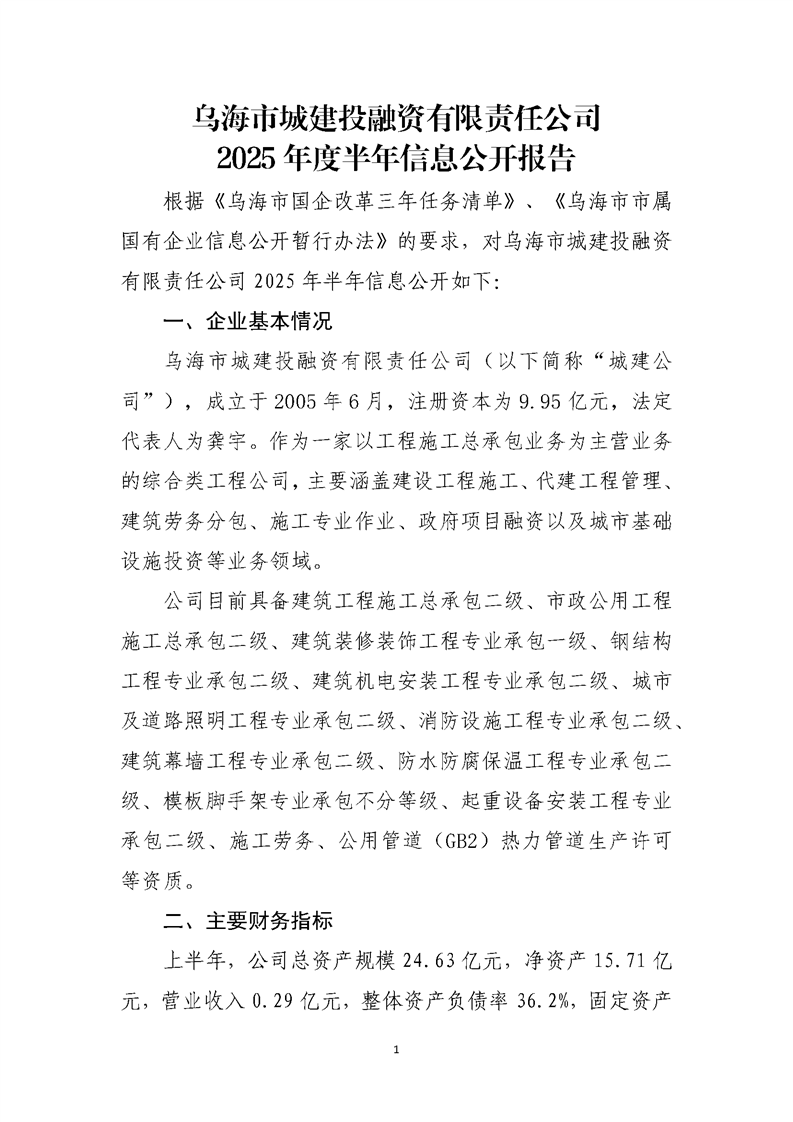 - 2025-04-10烏海市城建投融資有限責任公司2024年度信息公開報告