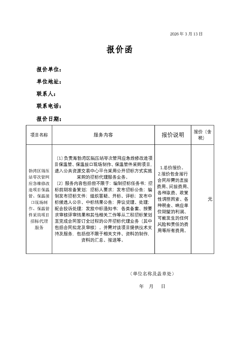 勃灣區(qū)隔壓站零次管網(wǎng)應(yīng)急維修改造項(xiàng)目保溫管、保溫接口現(xiàn)場(chǎng)制作、保溫管件采購(gòu)項(xiàng)目招標(biāo)代理服務(wù)【招標(biāo)公告】